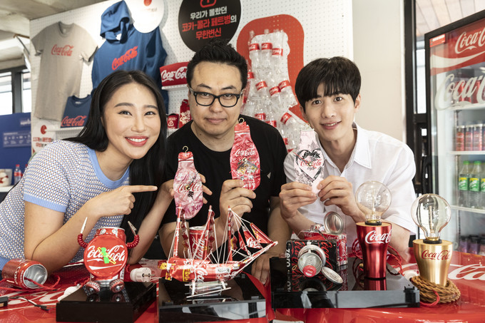 코카콜라가 27일 서울 마포구 연남동 '쓰레기마트'에서 이색 재활용 체험행사를 진행한 가운데 모델들이 코카-콜라 빈 캔으로 만든 시계를 들고 있다.