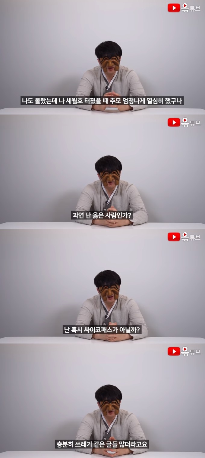 윾튜브는 다음날 올린 '나의 죄'라는 제목의 영상을 통해 사과를 이어갔다. 그는 "그냥 내가 인간쓰레기였다. 내가 내 글을 다시 봐도 인간으로서 결여된 부분이 보인다. 다시 보는 게 정말 괴롭다. 세월호 침몰 사건 당시 내가 페이스북에서 추모를 열심히 했는데 커뮤니티 사이트에서는 조롱하고 있더라. 그런 글을 썼는지 기억이 안 났고 몰랐다"고 털어놨다.