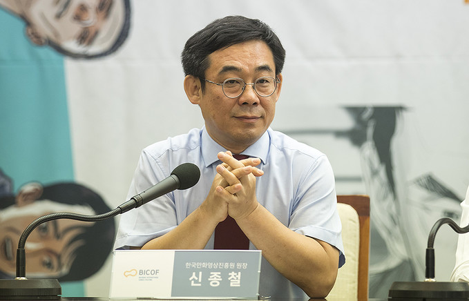 신종철 한국만화진흥원장이 10일 오전 서울 중구 프레스센터에서 열린 제22회 부천국제만화축제 공식 기자회견에 참석해 있다.