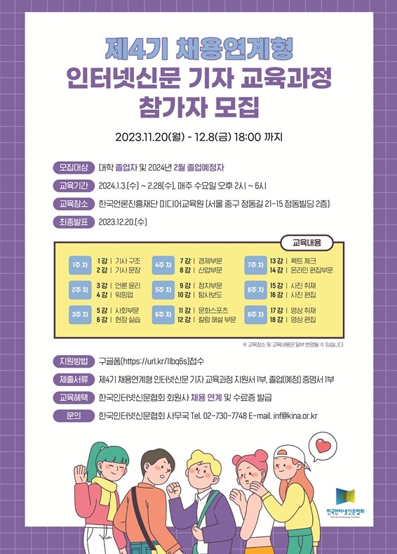 한국인터넷신문협회(회장 이의춘) 부설 KINA교육센터(센터장 김창영, 세이프타임즈 대표)는 오는 20일부터 12월 8일까지 제4기 채용연계형 인터넷신문 기자 교육과정 참가자를 모집한다고 7일 밝혔다.