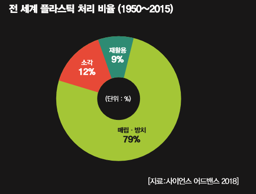 미국 캘리포니아주립대와 조지아주립대 공동연구팀이 2018년 '사이언스 어드밴스(Science Advances)'에 발표한 논문에 따르면 플라스틱이 본격적으로 생산되기 시작한 1950년부터 2015년 사이에 전 세계에서 생산된 플라스틱의 양은 약 83억t에 달한다. 그중 79%는 매립되거나 쓰레기로 방치됐고, 12%는 소각됐다. 재활용된 비율은 9%에 불과하다.
