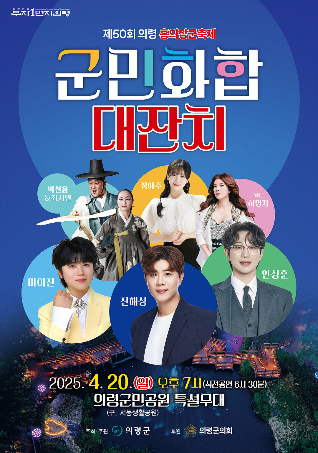 의령군은 의령군민공원 특설무대에서 20일 오후 7시 제50회 홍의장군축제를 기념하는 '군민 화합 대잔치' 공연을 개최한다.