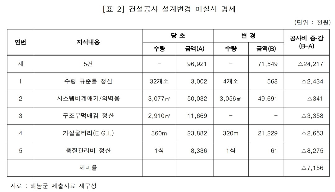 전남도는 "해남군이 공사비 2422만 원을 설계 변경한 뒤 감액해야 하는데도 아무런 조치를 하지 않아 예산 낭비 우려를 초래했다"고 꼬집었다.