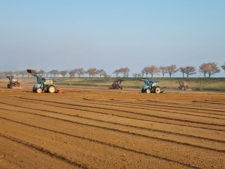 하남읍 백산리 472-3번지 일원 낙동강 친수공간에 30여명의 이장들은 아침부터 본인의 트랙터와 농기계를 활용해 로터리 작업과 파종작업을 실시했다.