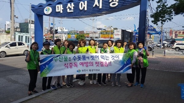 ▲ 창원시 환경위생과 직원들이 마산어시장 입구 앞에서 소비자식품위생감시원과 함께 식중독예방 홍보 캠페인을 펼치고 있는 모습 [창원시 제공 자료사진]