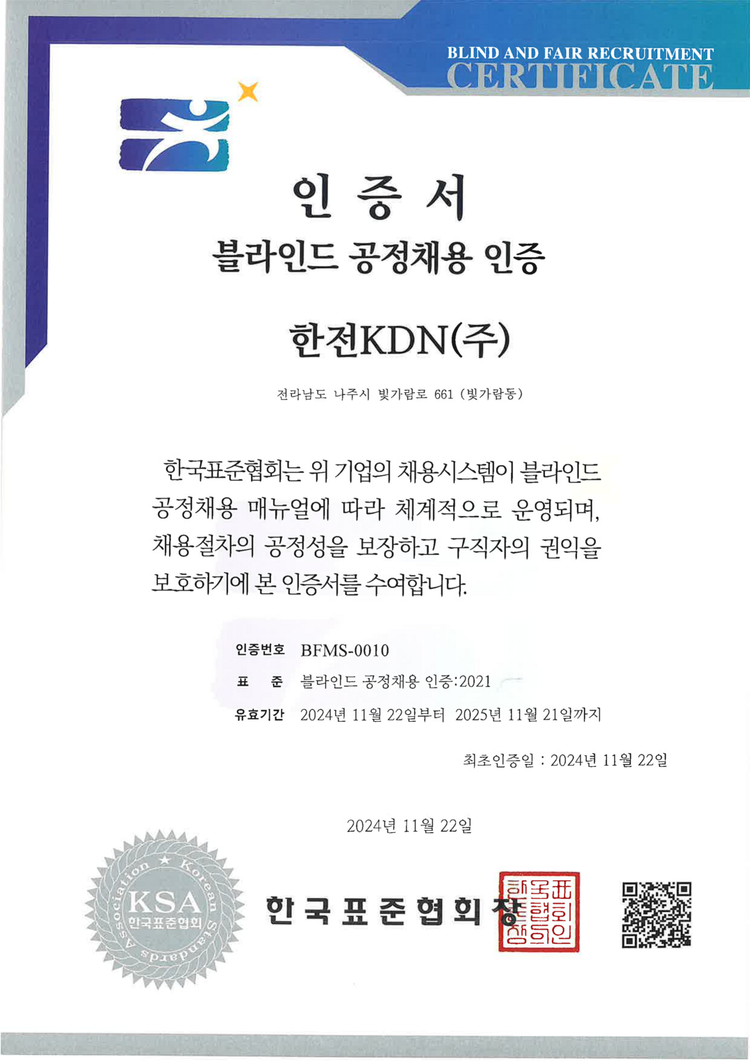 | ▲ 한국표준협회 '블라인드 공정채용 인증서' [한전KDN 제공] |