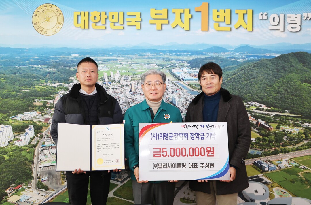 경남 의령군 용덕면에 위치한 건설폐기물 중간처리업체 ㈜탑리사이클링(대표 주성현)은 지난 16일 의령군청에 장학기금 500만 원을 기탁했다.
