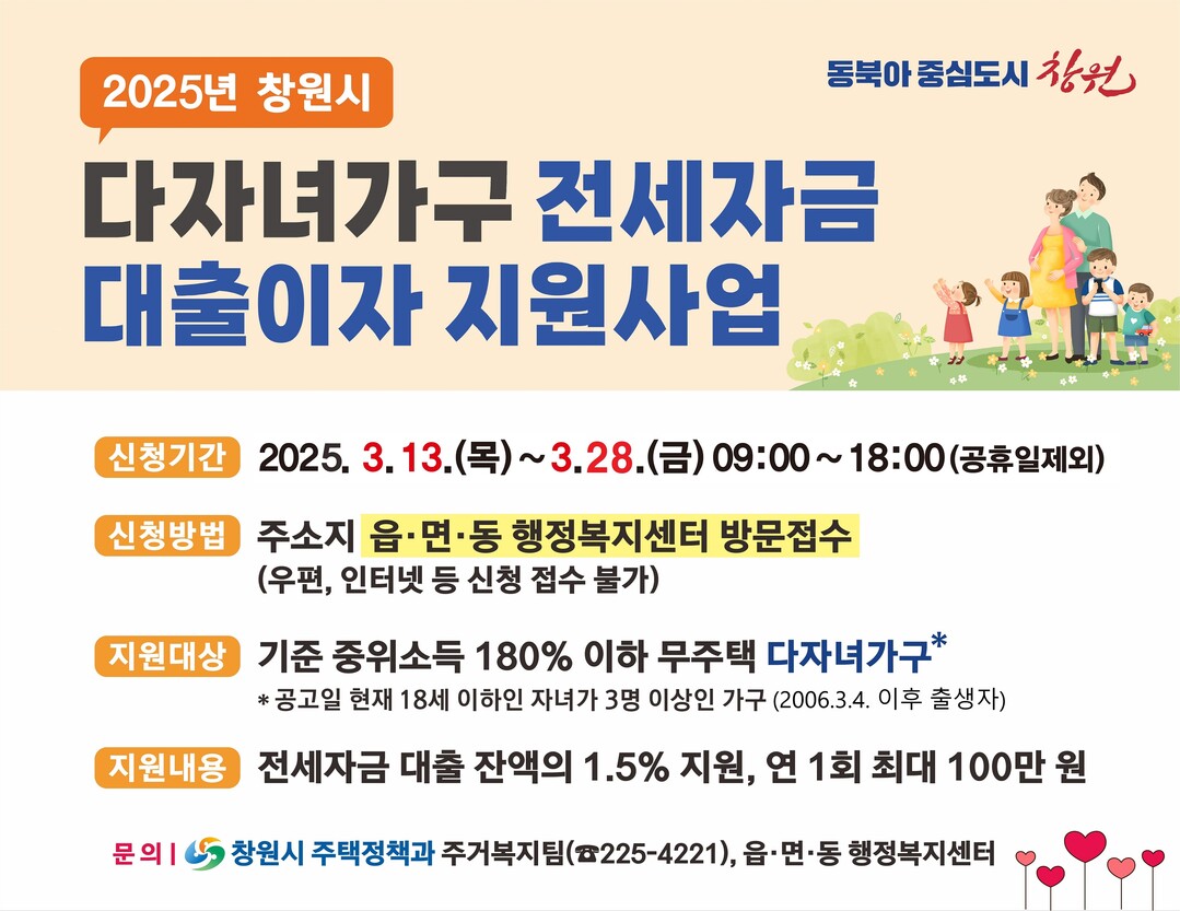 창원시, 다자녀 가구에 전세자금 대출이자 최대 100만원 지원