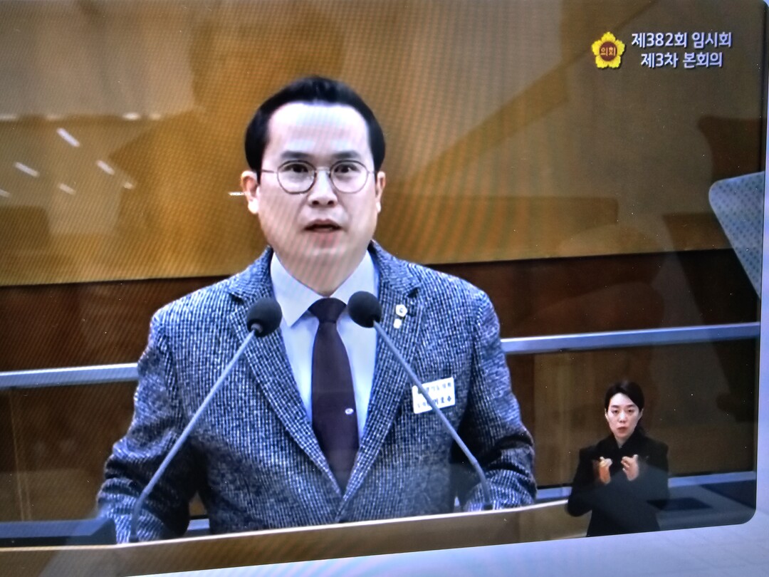 | ▲ 20일 열린 제382회 경기도의회 임시회 3차본회의에서 농정해양위원회 이오수 위원이 5분발언을 하고 있다.[경기도의회 중계화면 캡처] |