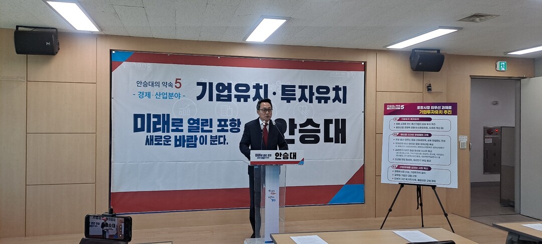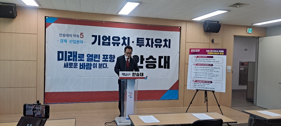 안승대(전 울산광역시 행정부시장) 포항시장 출마예정자는 8일 포항시청 브리핑룸에서 기자회견을 갖고 기업유치와 투자유치로 포항의 경제를 다시 뛰게 하겠다고 밝혔다.