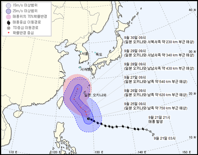 25일 기상청은 지난 21일 괌 북서쪽 해상에서 발생한 제24호 태풍 짜미가 이날 오전 9시 일본 오키나와 남쪽 750km 부근 해상에서 북상 중이라고 밝혔다.