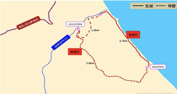 고성의 경우 통일전망대에서 시작해 해안 철책을 따라 금강산전망대까지 이어지는 코스로, 왕복 구간을 차량으로 이동하는 별도 코스도 운영된다.