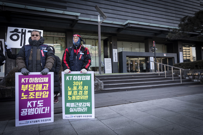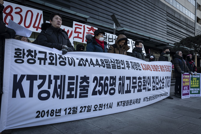 KT노동인권센터, KT전국민주동지회가 27일 오전 서울 종로구 KT광화문 사옥앞에서 '강제퇴출 256명 해고무효확인 집단소송' 기자회견을 열고 있다.