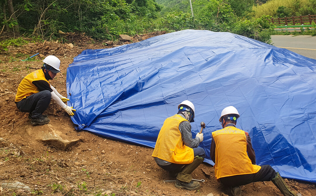 | ▲ 창녕군 산사태현장예방단이 방수포를 덮고 있다. [창녕군 제공] |