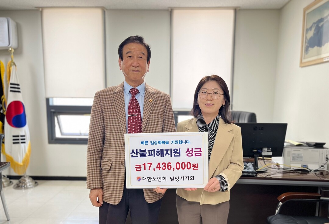 사단법인 대한노인회 경남 밀양시지회(지회장 신준철)는 산불 피해 복구와 이재민 지원을 위해 지난 1일부터 9일까지 성금 1743만6000원을 모금, 10일 밀양시에 기했다.
