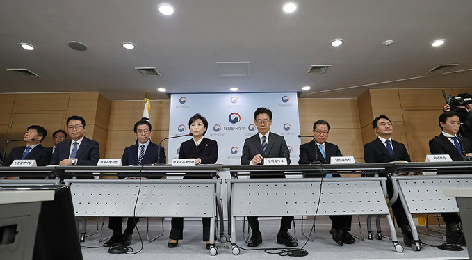 김현미(왼쪽 세번째) 국토교통부 장관이 19일 오전 서울 종로구 정부서울청사에서 수도권 3기 신도시 입지와 2기 수도권 광역교통대책을 발표하고 있다.