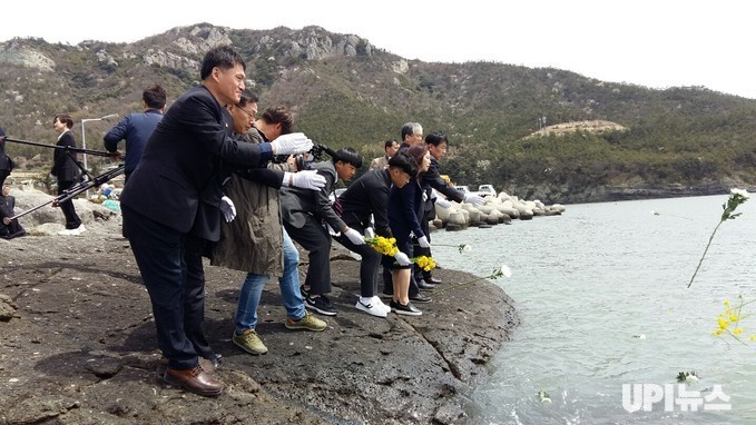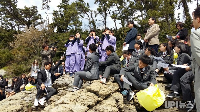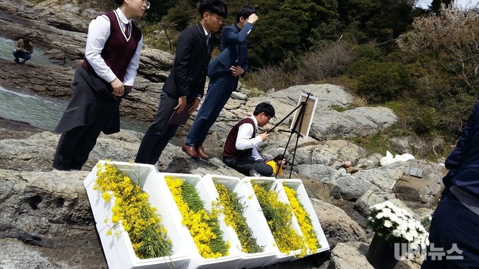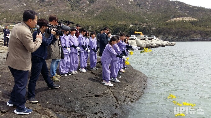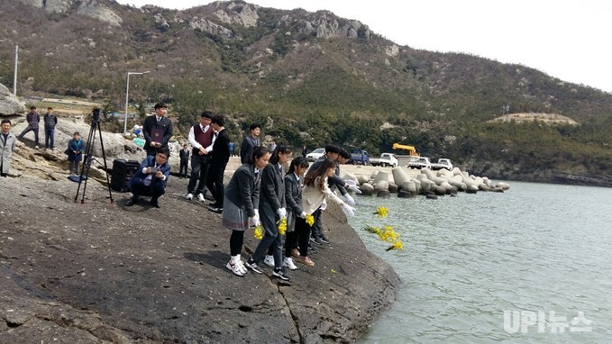 세월호 참사 5주기인 4월 16일 오전 조도 초·중·고학생들이 조도 읍구나래 해변에서 세월호 추모행사를 하고 있다. 이날 행사에는 장석웅 교육감 등이 참석했다.