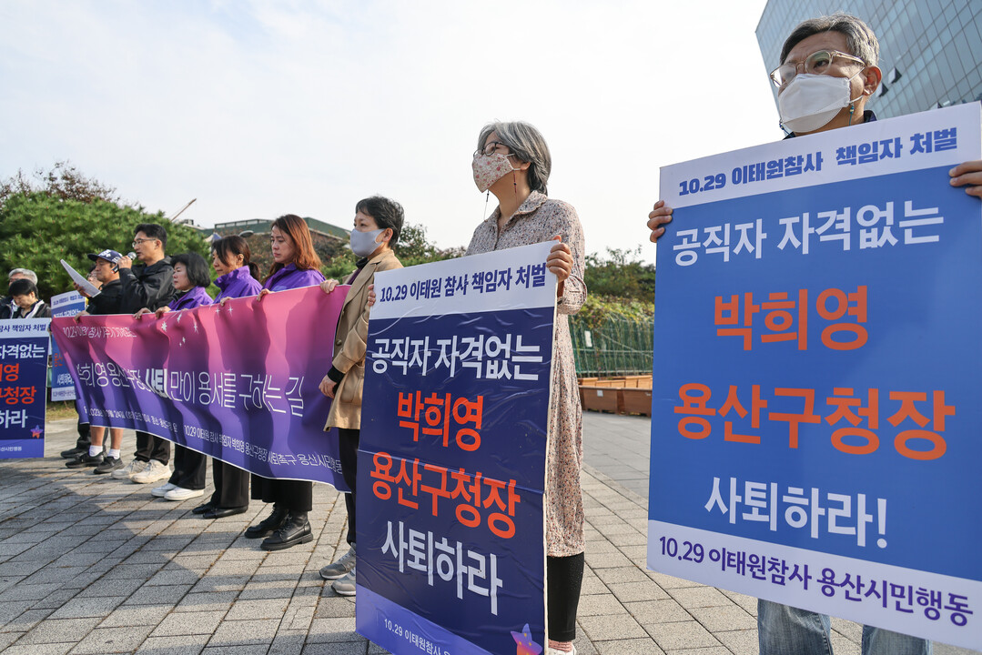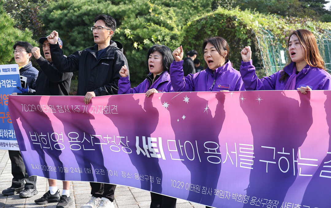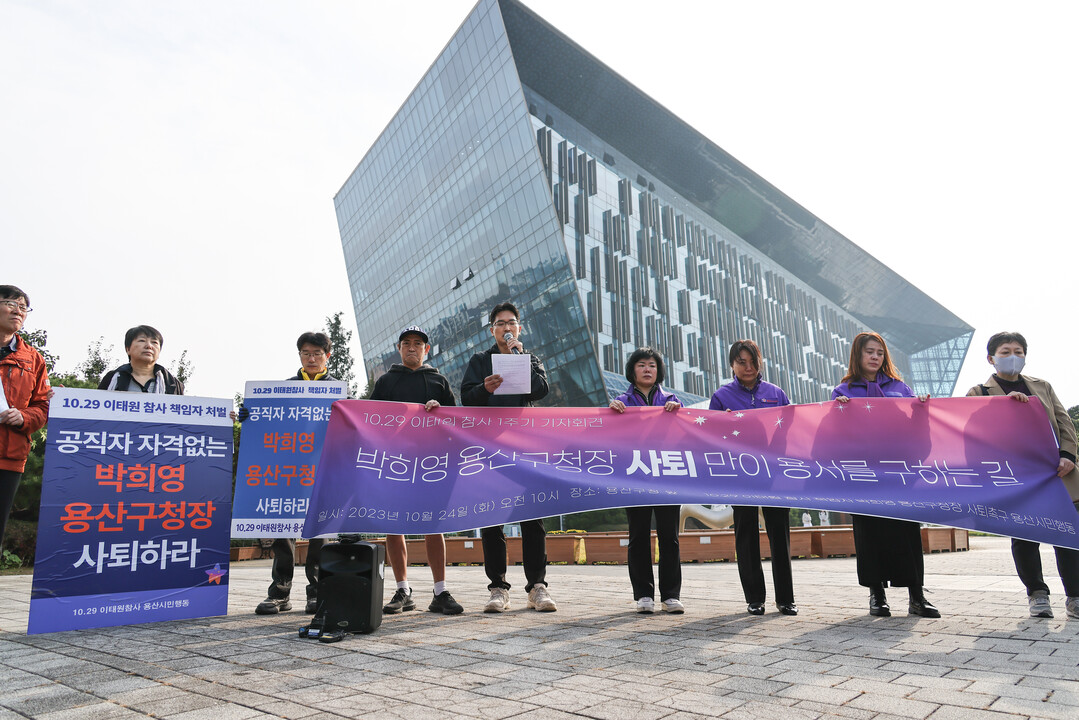 10·29 이태원 참사 책임자 박희영 용산구청장 사퇴를 촉구하는 용산시민행동 회원들이 24일 오전 서울 용산구청 앞에서 기자회견을 열었다.