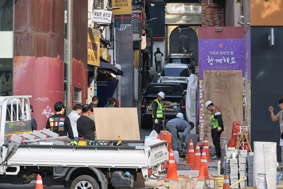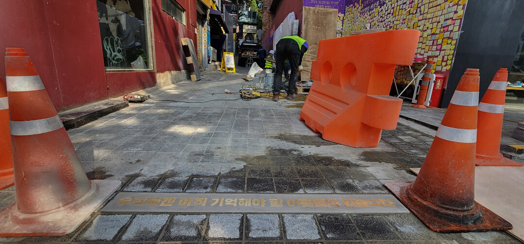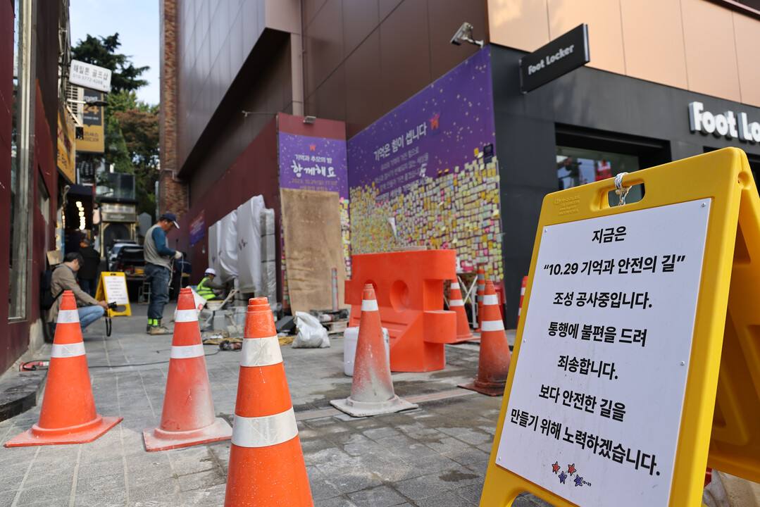| ▲ '10·29 기억과 안전의 길' 조성공사가 한창인 이태원 참사 현장. [이상훈 선임기자] |
