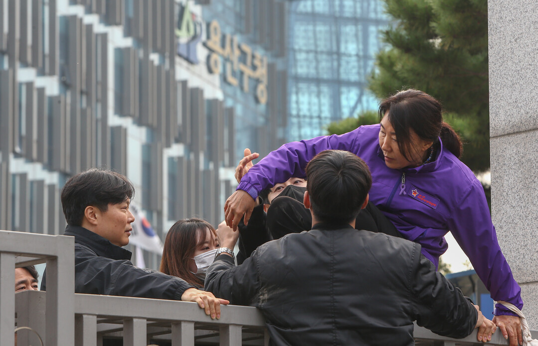| ▲ 10·29 이태원 참사 책임자 박희영 용산구청장 사퇴를 촉구하는 용산시민행동 회원과 유가족들이 24일 오전 서울 용산구청 앞에서 기자회견을 열기 위해 정문을 넘어가고 있다. [이상훈 선임기자] |
