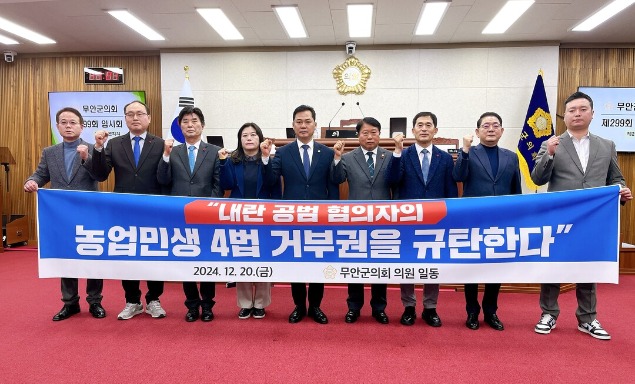 이호성 무안군의회 의장을 비롯한 의원 9명은 "거부권 행사에 대해 한덕수 대행과 송미령 장관에게 반드시 책임을 물을 것이다"며 "농정을 정상화하고 민생을 회복하는 길만이 국민에게 사죄하는 유일한 길이다"고 강조했다.