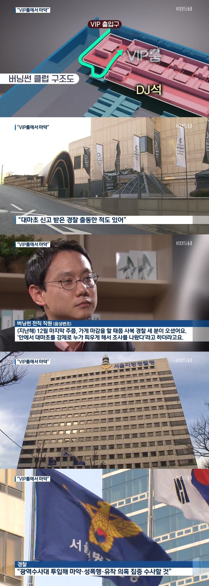 클럽 내 DJ석 뒤에 있는 VIP 룸에서 마약 투약을 한 이가 있다는 주장이었다. 버닝썬 전직 직원은 "(지난해) 12월 마지막 주쯤 가게 마감할 때 쯤 사복 경찰 세 분이 왔다"며 "'안에서 대마초를 강제로 누가 피우게 해서 조사를 나왔다'고 하더라"고 털어놨다.