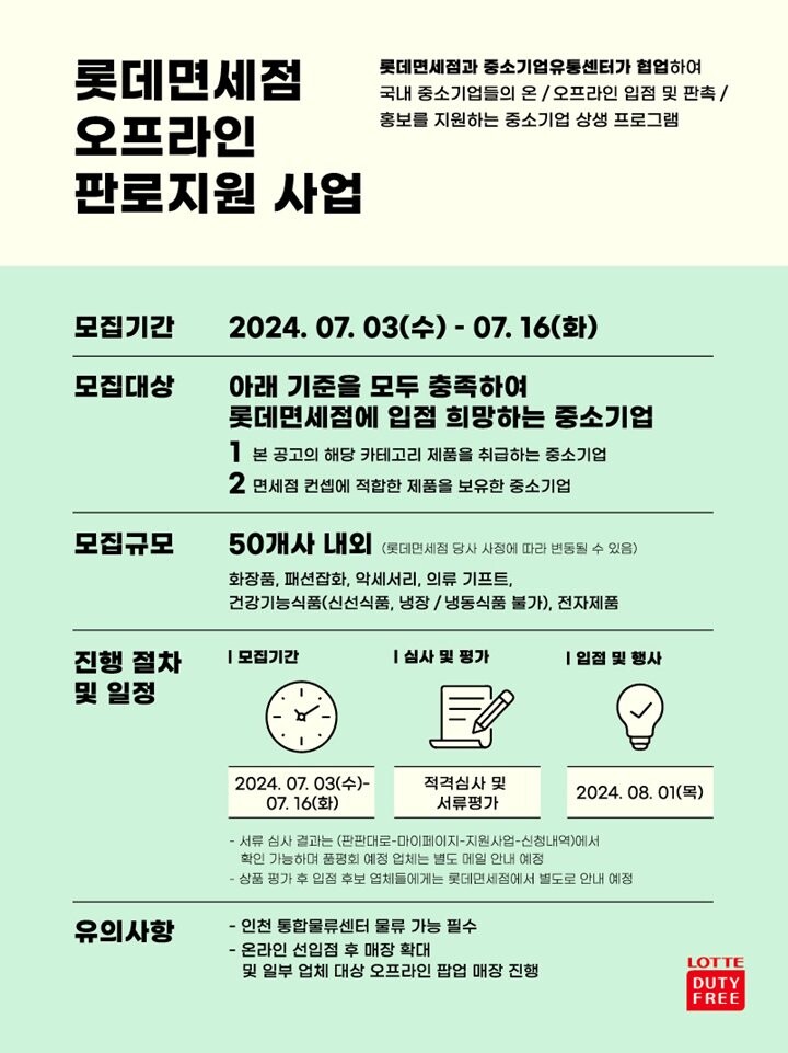 롯데면세점은 오는 16일까지 중소기업유통센터의 판로 정보 플랫폼 '판판대로'를 통해 우수 중소기업을 모집한다. 이후 적격심사와 서류 평가를 거쳐 50개 브랜드를 선정하고 이들의 롯데면세점 온오프라인 채널 입점을 추진할 예정이다.