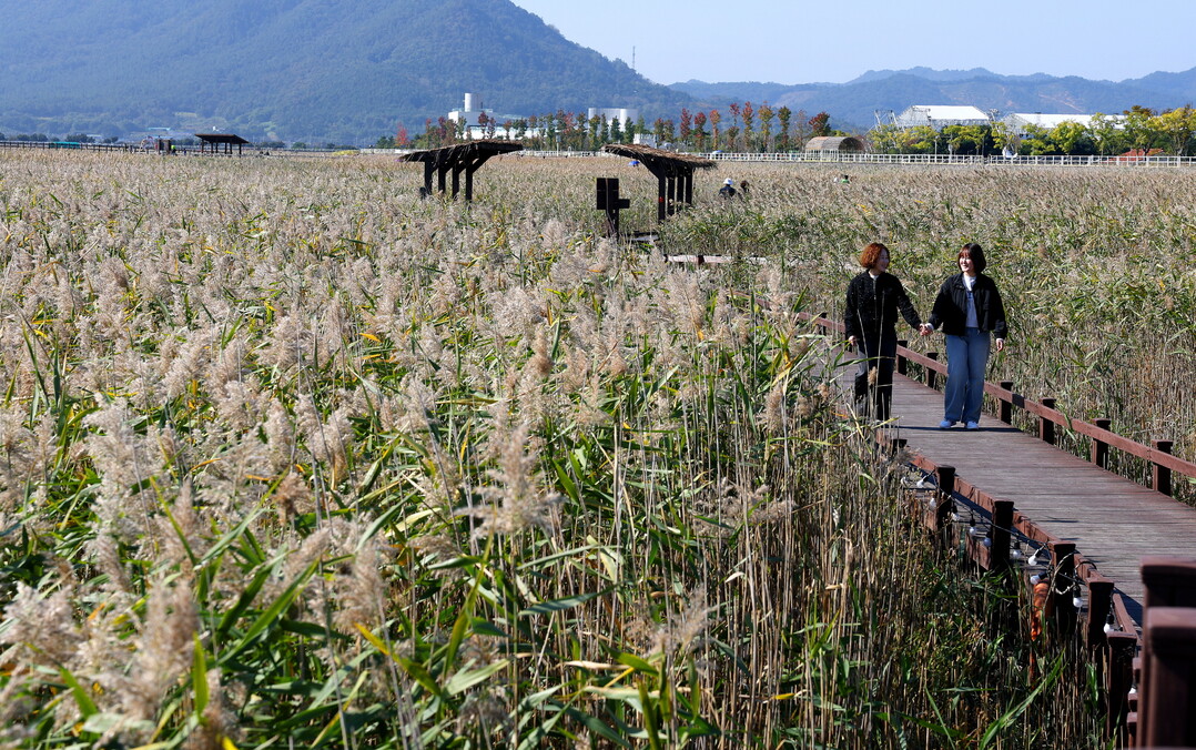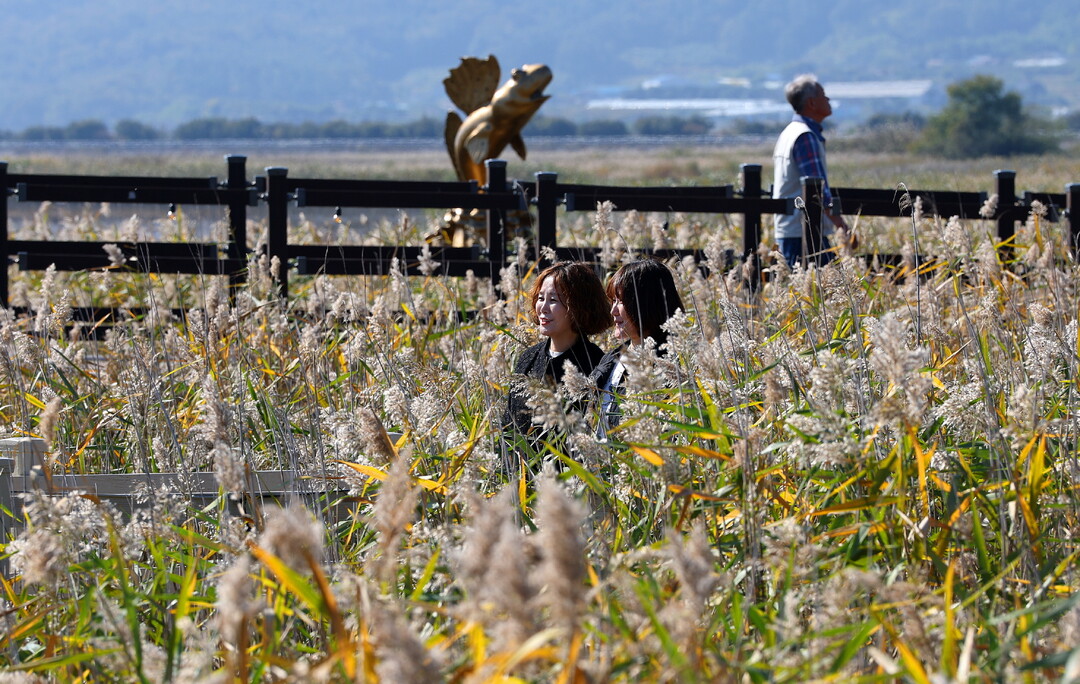 | ▲ 11월 2일까지 이어지는 '강진만 춤추는 갈대축제'를 방문한 관광객이 가을 정취를 즐기며 갈대밭을 거닐고 있다. [강진군 제공] |