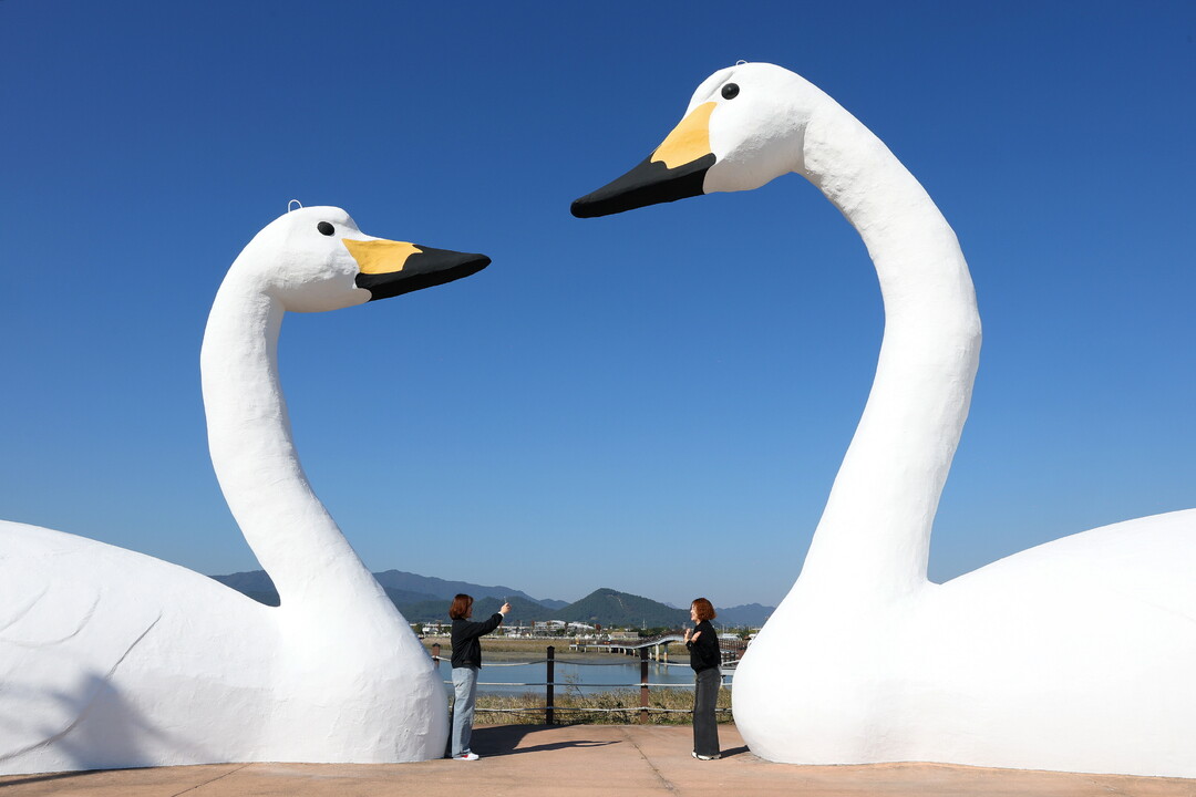 | ▲ 11월 2일까지 이어지는 '강진만 춤추는 갈대축제'를 방문한 관광객이 큰 고니 조형물에서 추억의 기념촬영을 하고 있다. [강진군 제공] |