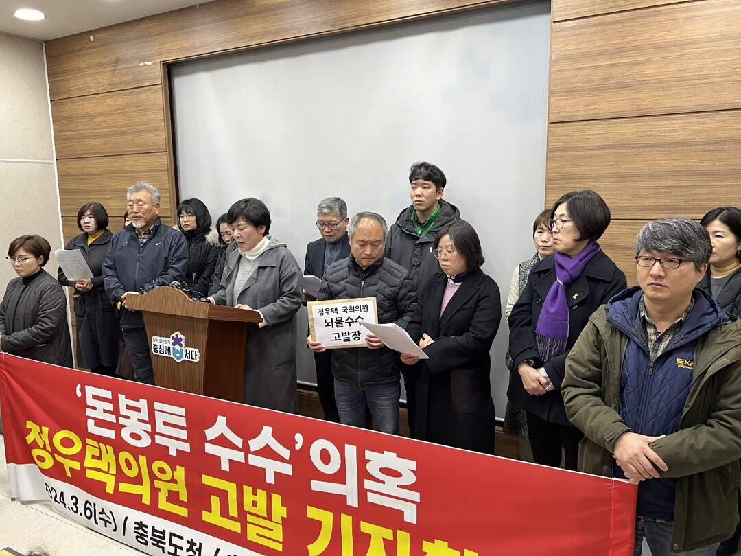이 단체는 "정우택 의원의 주장대로라면 허위사실을 유포한 자를 처벌해야 마땅하고, 만약 업자의 주장이 맞다면 정 의원은 뇌물죄로 처벌해야 한다"며 철저한 조사로 진실을 밝혀 시민들의 알 권리를 보장하라고 촉구했다.
