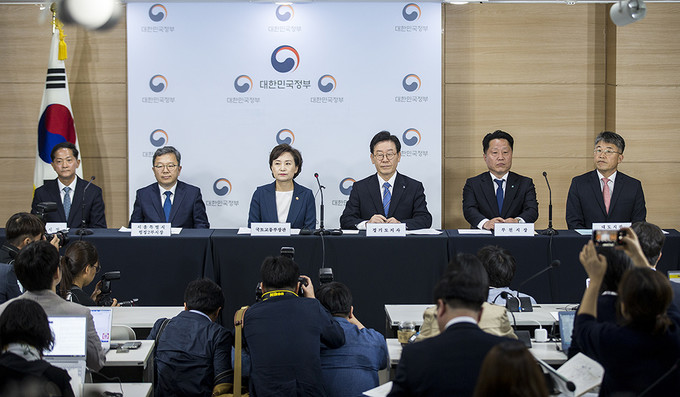 김현미 국토교통부 장관이 7일 오전 서울 종로구 정부서울청사에서 열린 '수도권 주택 30만호 공급방안 - 제3차 신규택지 추진계획' 발표 브리핑에 참석하여 이재명 경기도지사, 최기주 대도시권광역교통위원회 위원장, 이재준 고양시장, 장덕천 부천시장, 진희선 서울시 행정2부시장과 함께 브리핑룸에 앉아 있다.