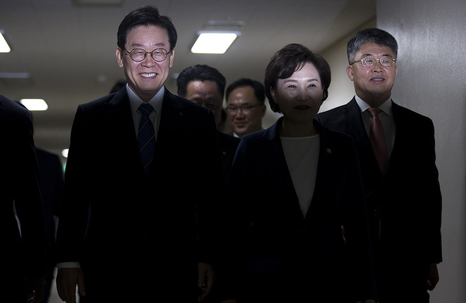 김현미 국토교통부 장관이 7일 오전 서울 종로구 정부서울청사에서 열린 '수도권 주택 30만호 공급방안 - 제3차 신규택지 추진계획' 발표 브리핑에 참석하기 위해 이재명 경기도지사, 최기주 대도시권광역교통위원회 위원장, 이재준 고양시장, 장덕천 부천시장, 진희선 서울시 행정2부시장과 함께 브리핑룸으로 들어고오 있다.