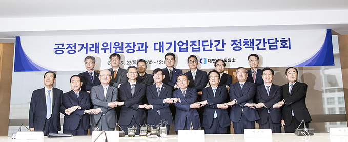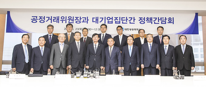 상조 공정거래위원장과 15개 기업 전문경영인이 23일 오전 서울 중구 대한상공회의소에서 열린 공정거래위원장과 대기업집단간 정책간담회에서 기념사진을 찍고 있다.