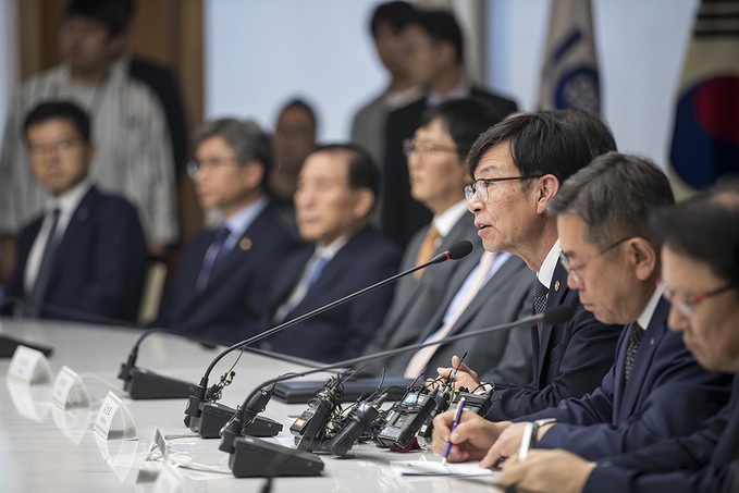 김상조 공정거래위원장이 23일 오전 서울 중구 대한상공회의소에서 열린 공정거래위원장과 대기업집단간 정책간담회에서 모두 발언을 하고 있다.