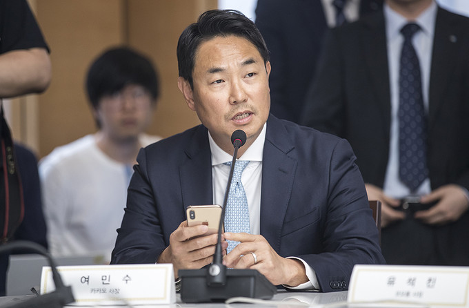 여민수 카카오 사장이 23일 오전 서울 중구 대한상공회의소에서 열린 공정거래위원장과 대기업집단간 정책간담회에서 인사말을 하고 있다.