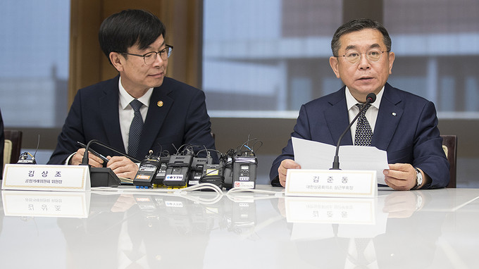 김준동 대한상공회의소 상근부회장이 23일 오전 서울 중구 대한상공회의소에서 열린 공정거래위원장과 대기업집단간 정책간담회에서 인사말을 하고 있다.
