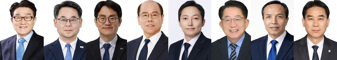 | ▲ 더불어민주당 양산시장 예비후보. 왼쪽부터 김일권, 박대조, 박재우, 박종서, 서상태, 임재춘, 조문관, 최선호.(가나다 순) |