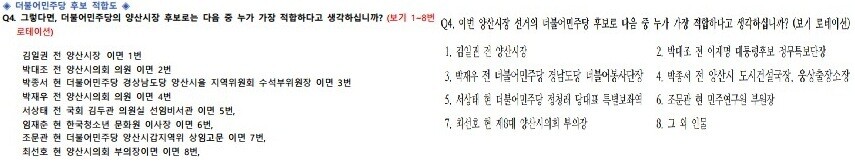 | ▲ 양산시장 선거 관련 동일 문항(Q4)이 포함된 서로 다른 여론조사 설문지 화면. 왼쪽은 2월 7~9일, 오른쪽은 2월 28일~3월 1일 실시된 조사다. [중앙선거여론조사심의위원회 게시 설문지 캡처] |