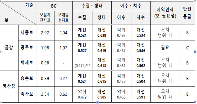 금강 백제보와 영산강 승촌보는 보를 없앨 때 발생하는 제반 비용이 해체했을 때의 총 편익보다 낮아 해체하지 않되, 장기적인 물 흐름 개선을 위해 상시 개방하는 게 합리적이라고 봤다.
