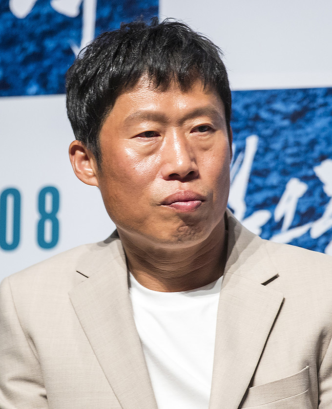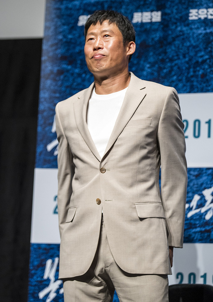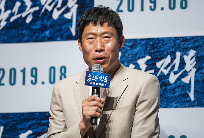 배우 유해진이 3일 오전 서울 강남구 압구정CGV에서 열린 영화 봉오동 전투 제작발표회에서 질문에 답하고 있다.