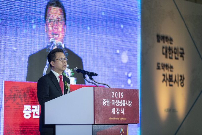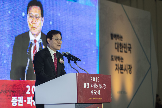 최종구 금융위원장이 2일 오전 서울 영등포구 여의도 KRX한국거래소에서 열린 2019 증권· 파생상품시장 개장식에 참석해 인사말을 하고 있다.