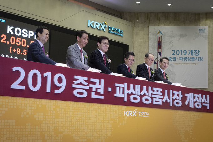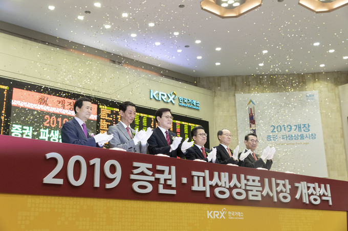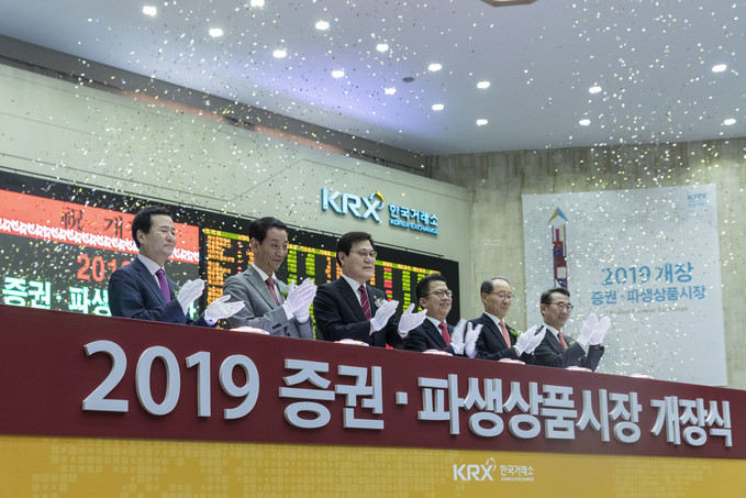 '2019 증권·파생상품시장 개장식'이 2일 오전 서울 영등포구 여의도 KRX한국거래소에서 정부 및 금융투자업계 관계자 300여명이 참석한 가운데 열리고 있다. 김재철 코스닥협회장, 권용원 금융투자협회장, 최종구 금융위원장, 정지원 한국거래소 이사장, 정구용 상장회사협의회장, 김군호 코넥스협회장(왼쪽부터)