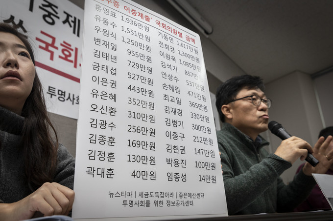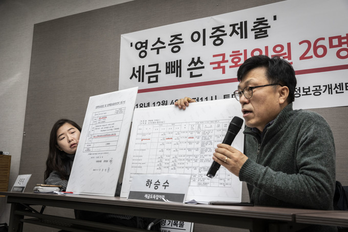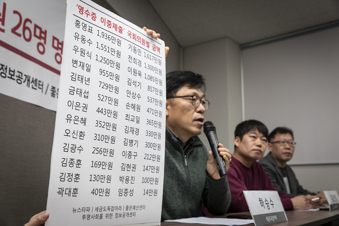 투명사회를위한정보공개센터,세금도둑잡아라,좋은예산센터와 뉴스타파 관계자들이 4일 서울 중구 성공회빌딩에서 '영수증 이중제출' 국회의원 26명의 명단을 공개하는 기자회견을 하고 있다.