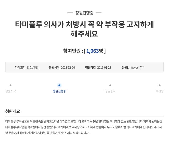 A양 고모는 24일 청와대 국민청원에 '타미플루 의사가 처방 시 꼭 약 부작용 고지하게 해주세요'라는 글을 올렸다. 그는 "저희가 원하는 건 타미플루 부작용을 식약청에서 일선 의사와 약사에게 의무사항으로 고지하게 만드는 것"이라고 말했다.