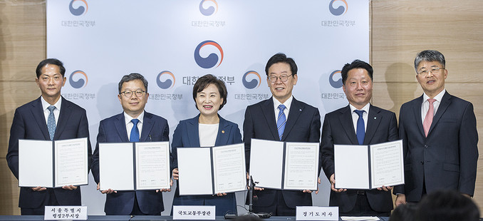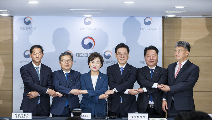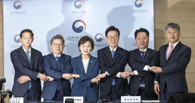 김현미 국토교통부 장관과 수도권 지방자치단체장들이 7일 오전 서울 종로구 정부서울청사에서 열린 '수도권 주택 30만호 공급방안 - 제3차 신규택지 추진계획' 발표 브리핑에서 업무협약을 마친 뒤 기념촬영을 하고 있다. 왼쪽부터 이재준 고양시장, 진희선 서울시 행정2부시장, 김현미 국토교통부 장관, 이재명 경기도지사, 장덕천 부천시장, 최기주 대도시권광역교통위원회 위원장.
