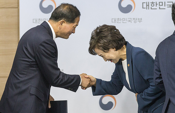 김현미 국토교통부 장관이 7일 오전 서울 종로구 정부서울청사에서 열린 '수도권 주택 30만호 공급방안 - 제3차 신규택지 추진계획' 발표 브리핑에서 업무협약을 마친 뒤 장덕천 부천시장과 악수를 하고 있다.