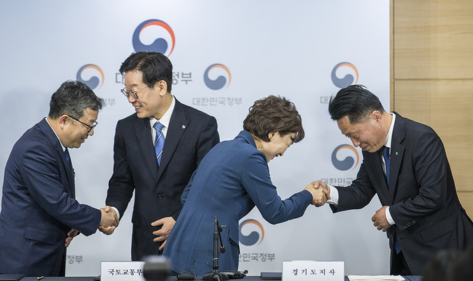 김현미 국토교통부 장관과 수도권 지방자치단체장들이 7일 오전 서울 종로구 정부서울청사에서 열린 '수도권 주택 30만호 공급방안 - 제3차 신규택지 추진계획' 발표 브리핑에서 업무협약을 마친 뒤 기념촬영을 하고 있다. 왼쪽부터 이재준 고양시장, 김현미 국토교통부 장관.