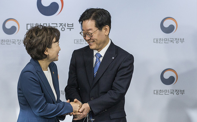 김현미 국토교통부 장관이 7일 오전 서울 종로구 정부서울청사에서 열린 '수도권 주택 30만호 공급방안 - 제3차 신규택지 추진계획' 발표 브리핑에서 업무협약을 마친 뒤 이재명 경기도지사와 악수를 하고 있다.