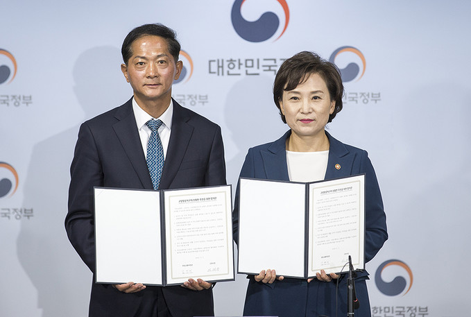 김현미 국토교통부 장관이 7일 오전 서울 종로구 정부서울청사에서 열린 '수도권 주택 30만호 공급방안 - 제3차 신규택지 추진계획' 발표 브리핑에서 업무협약을 마친 뒤 이재준 고양시장과 악수를 하고 있다.