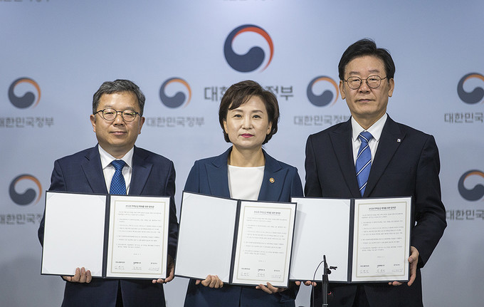 김현미 국토교통부 장관과 수도권 지방자치단체장들이 7일 오전 서울 종로구 정부서울청사에서 열린 '수도권 주택 30만호 공급방안 - 제3차 신규택지 추진계획' 발표 브리핑에서 업무협약을 마친 뒤 기념촬영을 하고 있다. 왼쪽부터 진희선 서울시 행정2부시장, 김현미 국토교통부 장관, 이재명 경기도지사.